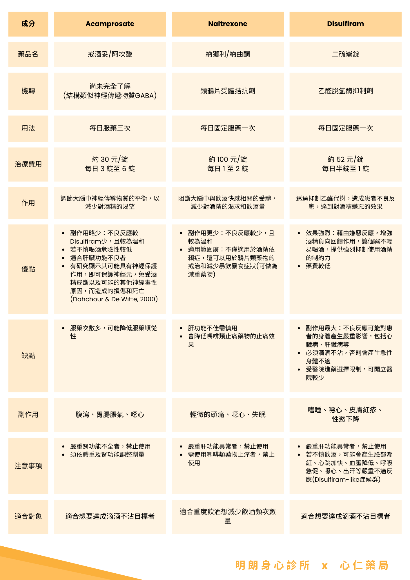 Acamprosate (戒酒妥/阿坎酸):調節大腦中神經傳導物質,減少對酒精的渴望,幫助患者維持戒酒狀態。