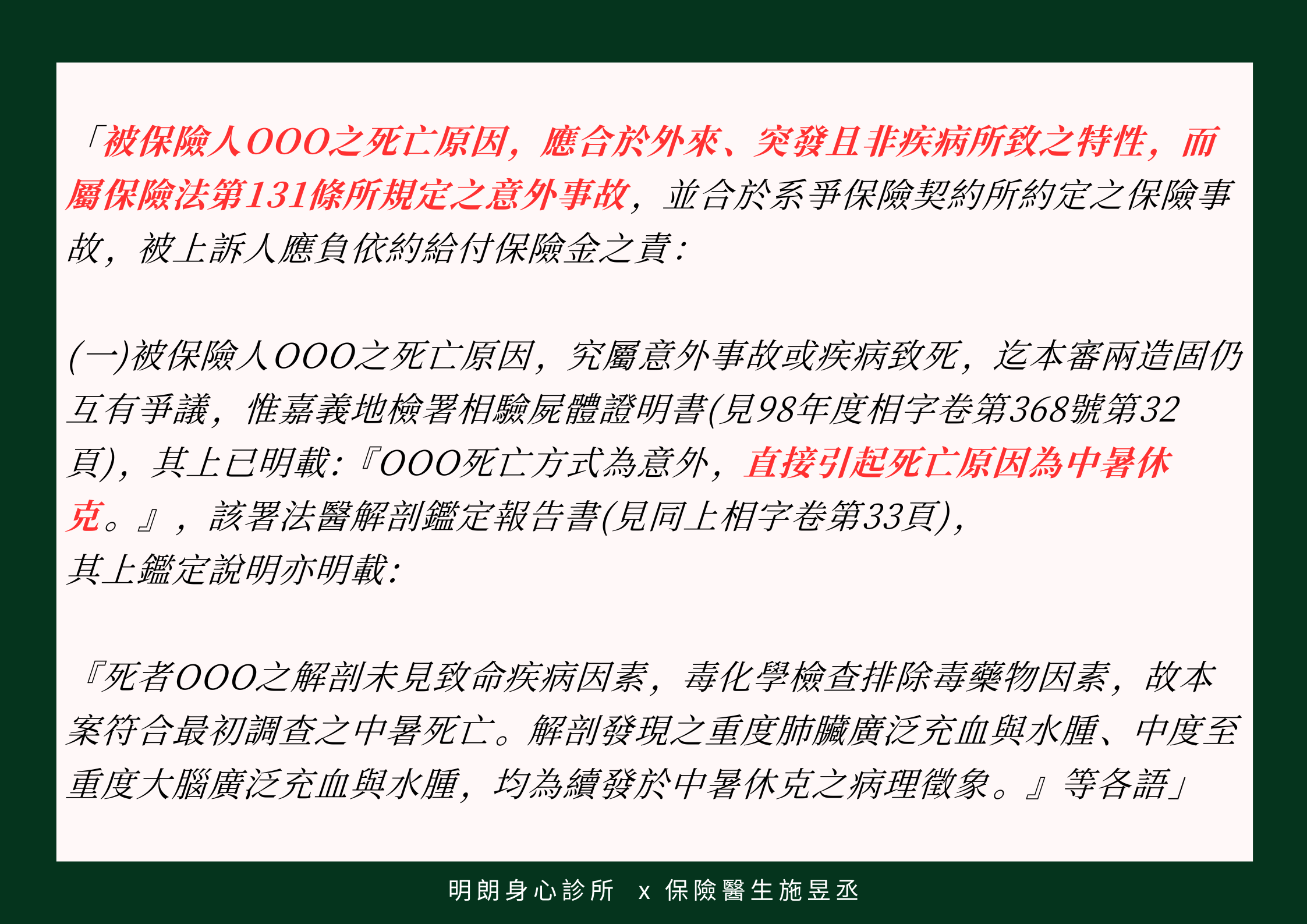所以,雖然保險公司多認定「中暑」可能不符合意外傷害事故之定義,但法院可不一定站在保險公司這邊哦!
