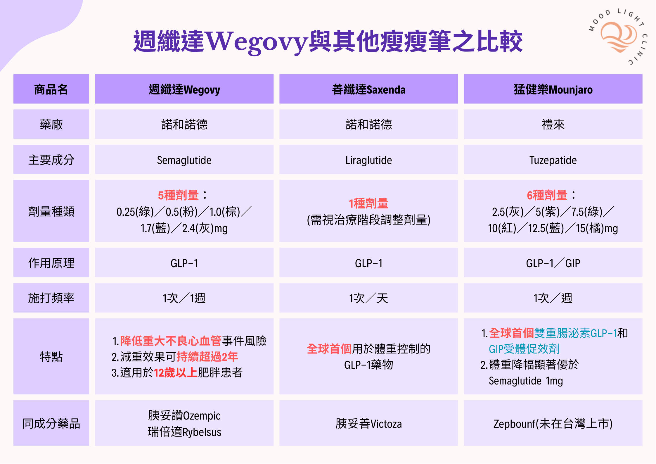 瘦瘦筆相關產品的主要成分皆為GLP-1受體促效劑(GLP-1 RAs),目前在台灣含有GLP-1受體促效劑的相關產品有: