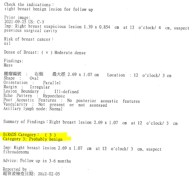 病歷記載之右乳房病變(lesion)變大當時之BI-RADS為3級,結果就收到以下照會單: