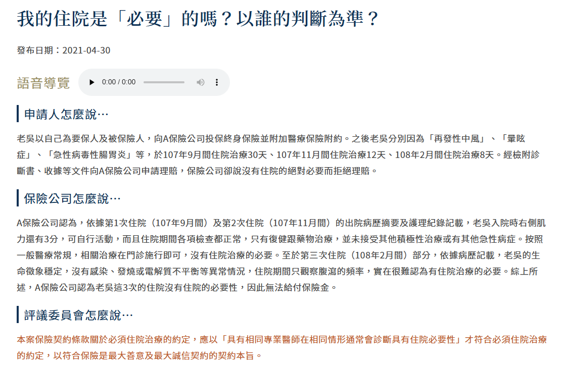 關於商業保險的住院定義,可參考先前的文章「【保險判決一點通】醫院沒床、在急診待床,保險會理賠嗎?─實際商業保險之住院認定」、「【保險江湖一點訣】日間留院可以理賠嗎?─日間留院與醫療險理賠」。