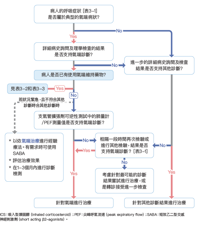 所以在診斷流程方面,症狀與病史的詢問,以及肺功能檢查是相當重要的,診斷流程及標準如下圖所示: