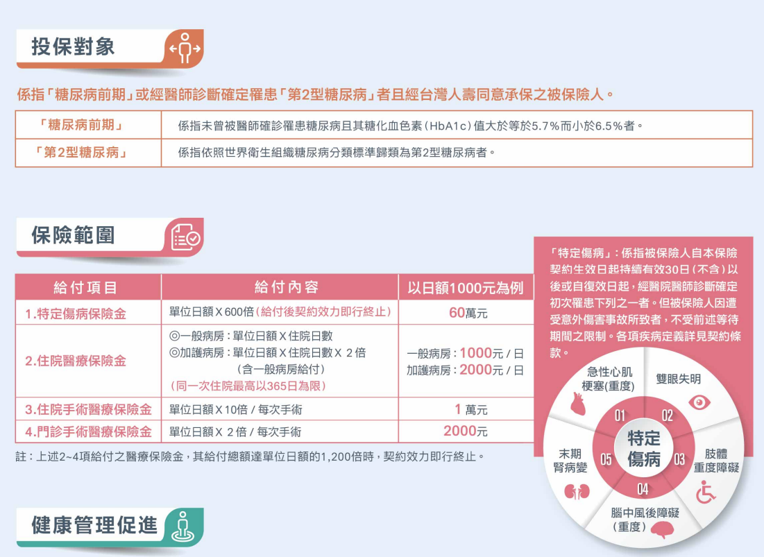因為台灣眾多糖友患者,也有醫療保險需求,有部分保險公司推出專針對糖友投保的醫療險,不過大多數公司是設計給糖尿病前期及第二型糖尿病患者投保的,如下圖所示: