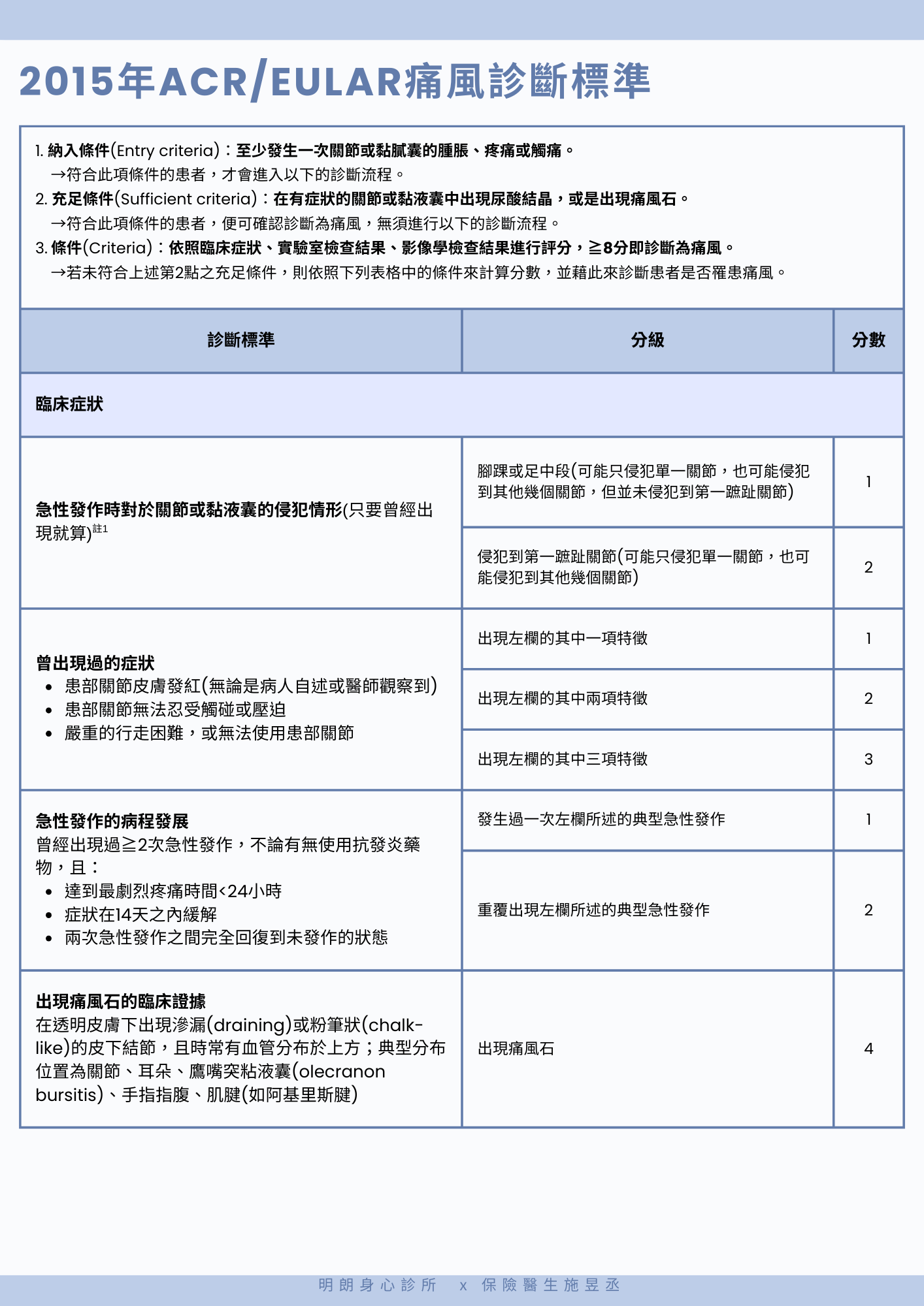 2015年,ACR及歐洲風濕病聯盟(European League Against Rheumatism, EULAR)共同推出了新版的痛風診斷標準,患者至少需發生一次關節或黏液囊的腫脹、疼痛或觸痛,若在有症狀的關節或黏液囊中出現尿酸結晶,或是出現痛風石,那就直接確診,否則須參考臨床症狀、實驗室檢查、影像學檢查等結果,進行分數計算,≧8分即診斷為痛風,如下圖所示: