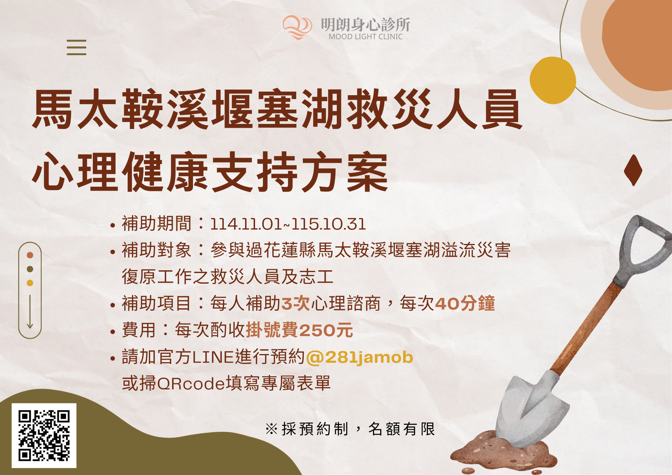 為提供救災人員及志工心理健康支持服務,衛生福利部特辦理「馬太鞍溪堰塞湖救災人員心理健康支持方案」明朗身心診所現已開放進行預約申請!(本方案與15~45歲青壯世代方案為不同方案,若先前使用過青壯世代方案者可以再使用該方案!)