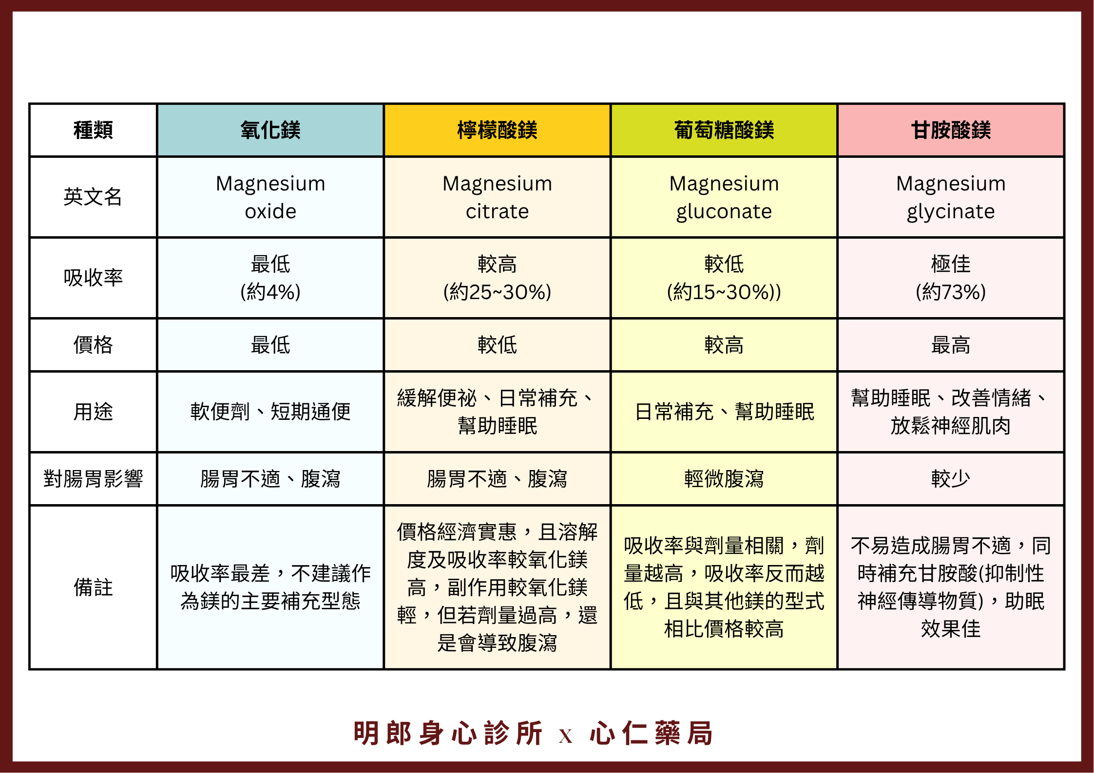 每種鎂都有其優缺點,如吸收率高低、副作用強弱及價格高低等,比較如下: