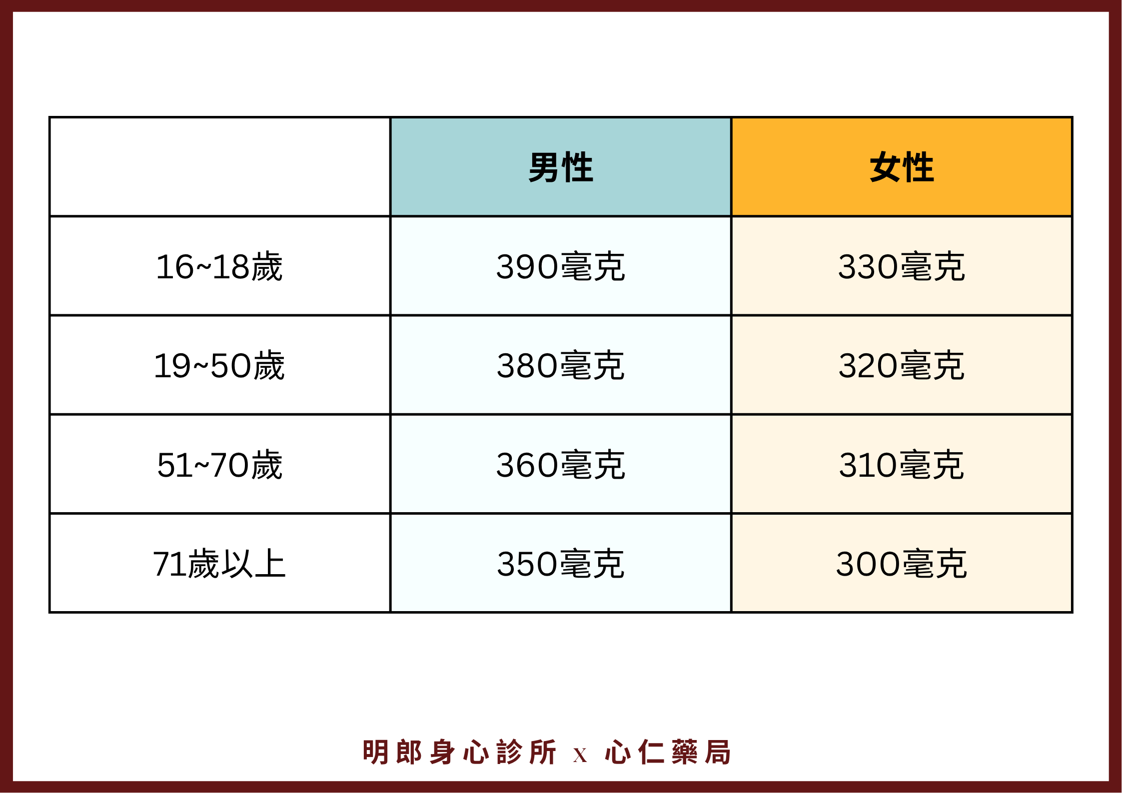 根據衛福部國民健康署「國人膳食營養素參考攝取量」,不同年齡層的建議每日鎂攝取量不同。