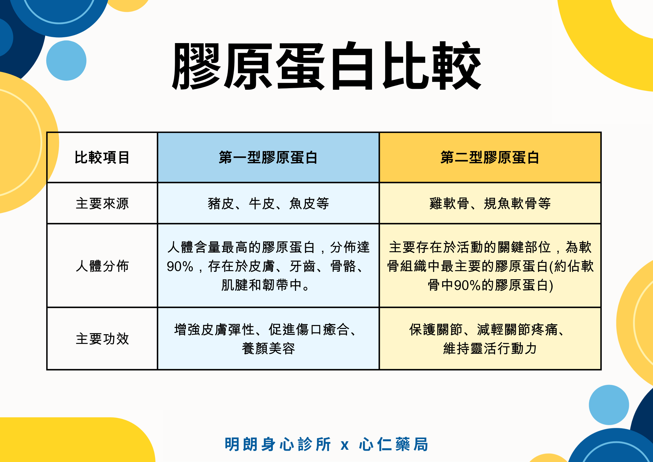 所謂的第二型膠原蛋白與主要用於養顏美容的第一型膠原蛋白不同,其主要功效為維持關節靈活度,目前市售的膠原蛋白都是以第一型及第二型為主,其比較表如下: