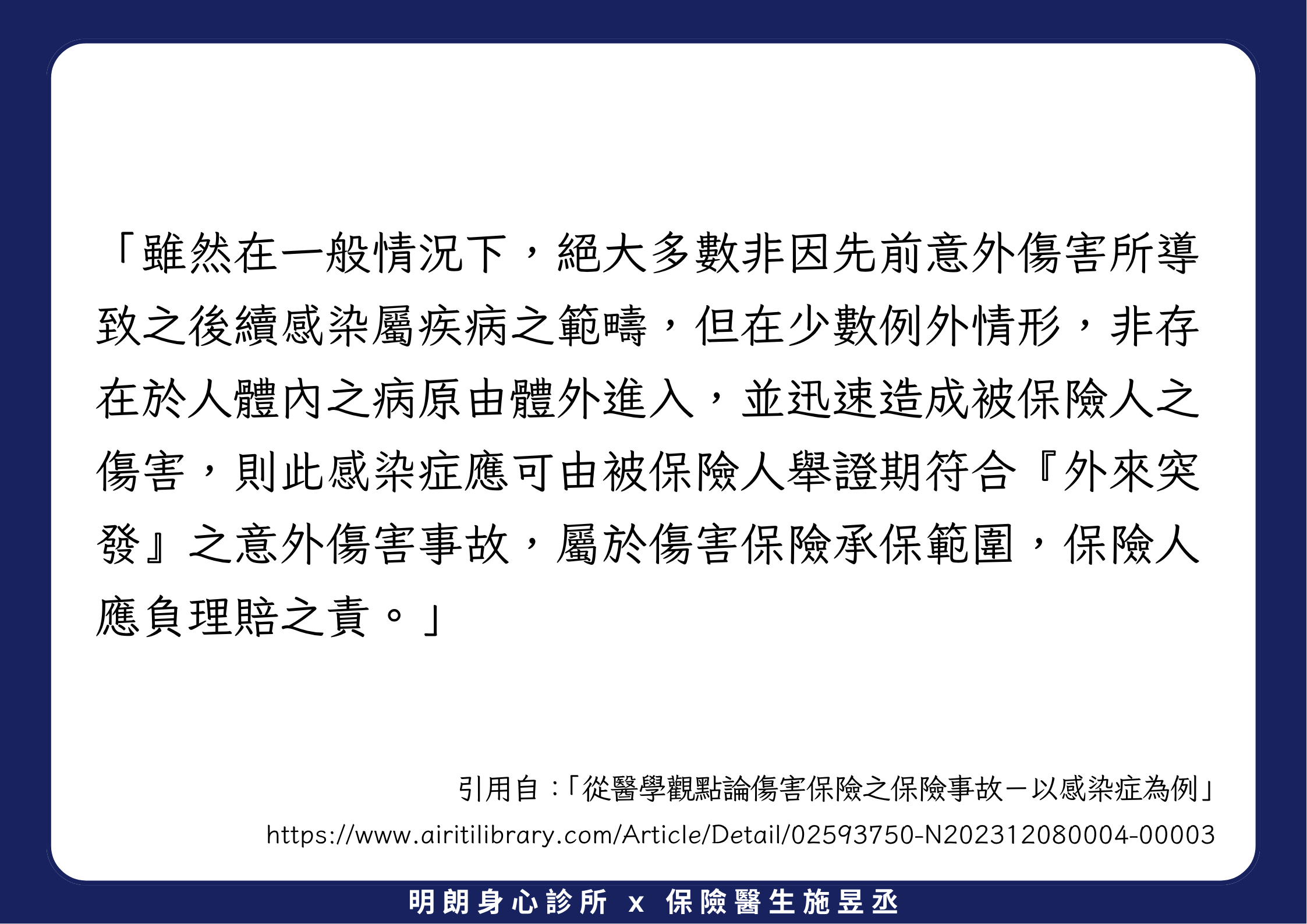 而根據「從醫學觀點論傷害保險之保險事故─以感染症為例」的觀點: