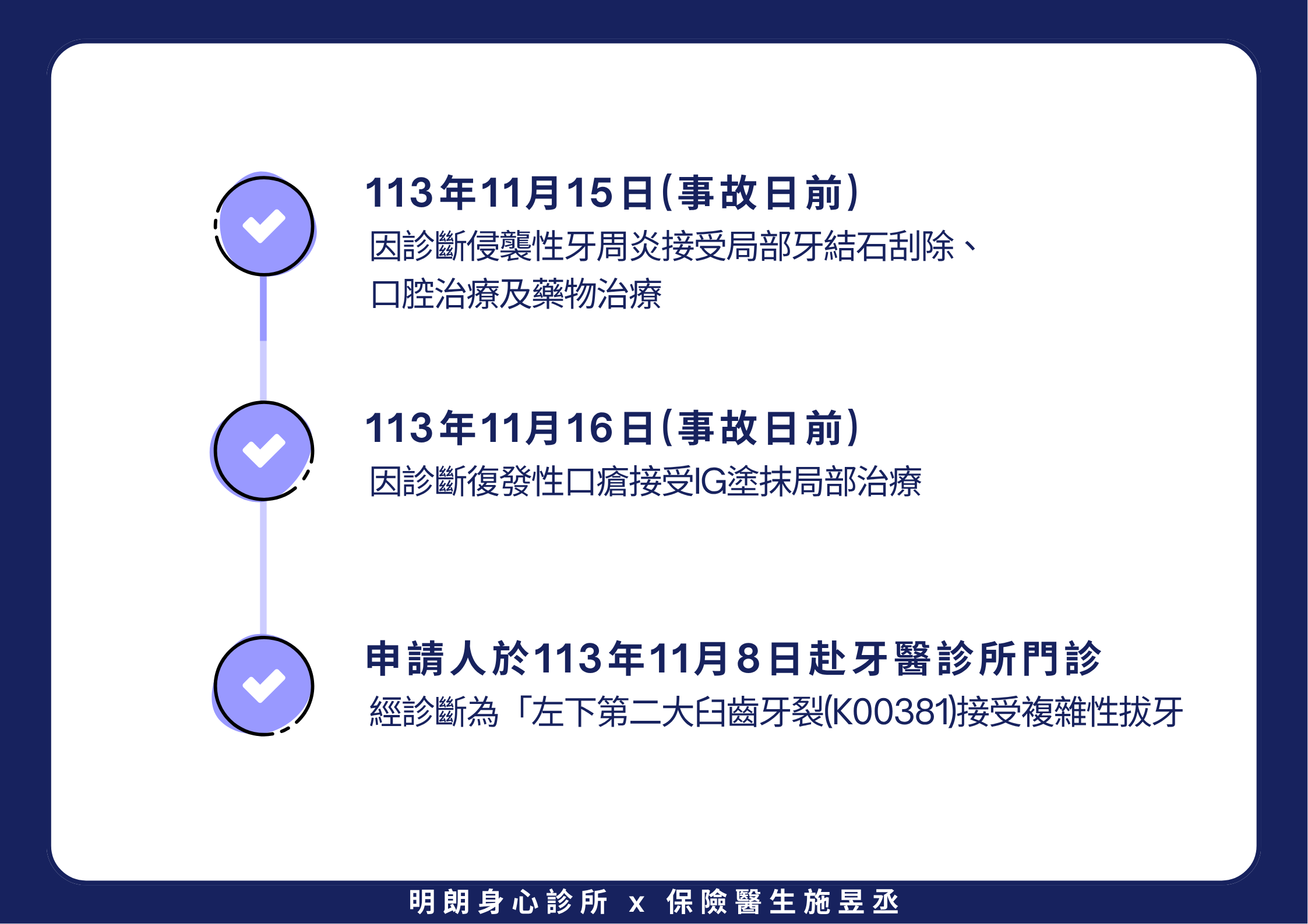 「申請人原主張113年11月18日吃東西咬到骨頭,續又主張113年11月15日咬硬物意外,致左下第二大臼齒牙裂(牙齒位置 #36)。依病歷記載,於主張之113年11月18日事故日前,即因診斷侵襲性牙周炎、復發性口瘡等疾病接受治療。」