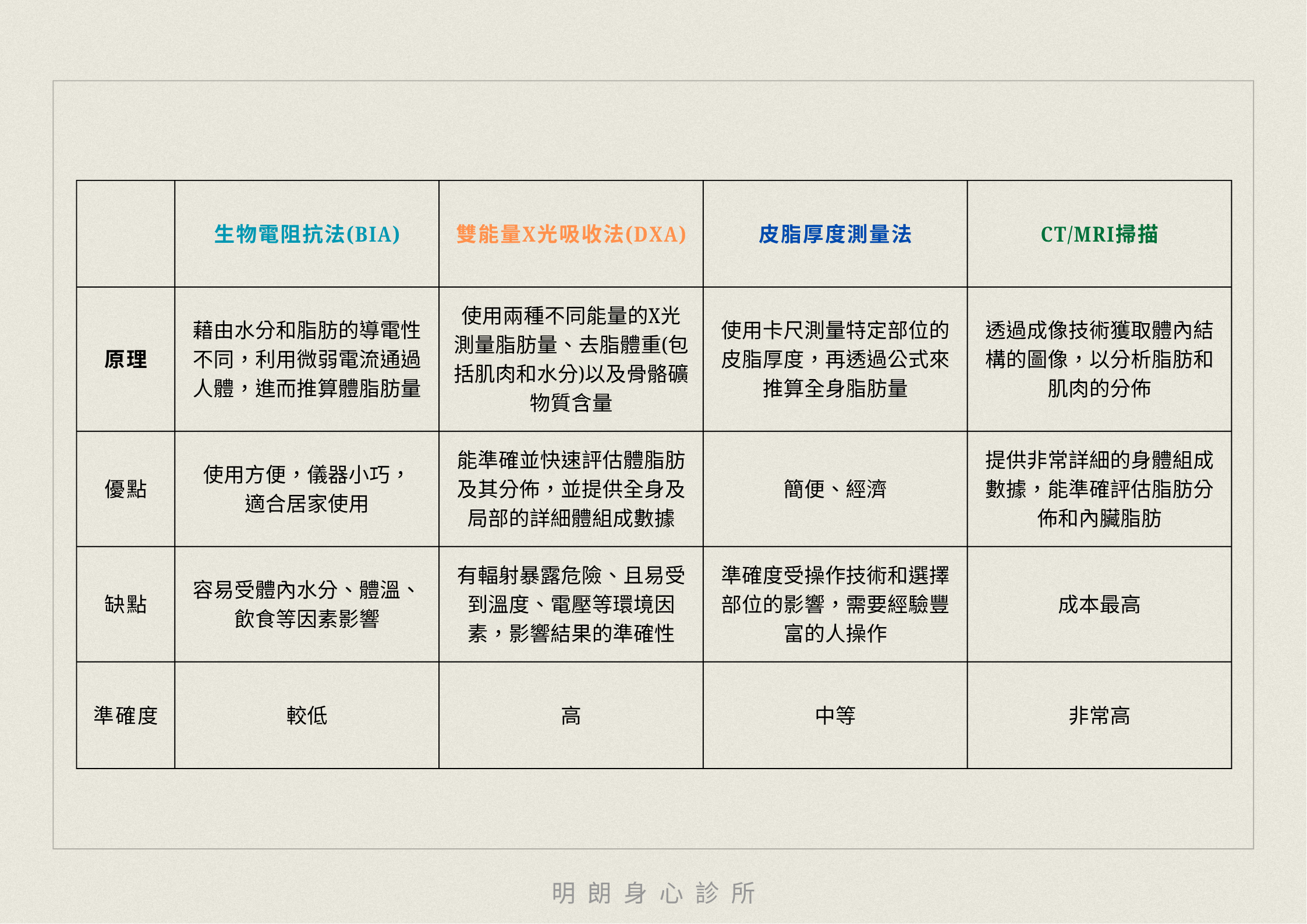 除了生物電阻抗法(BIA),目前還有其他三個精準測量體脂的方法,其比較表格如下: