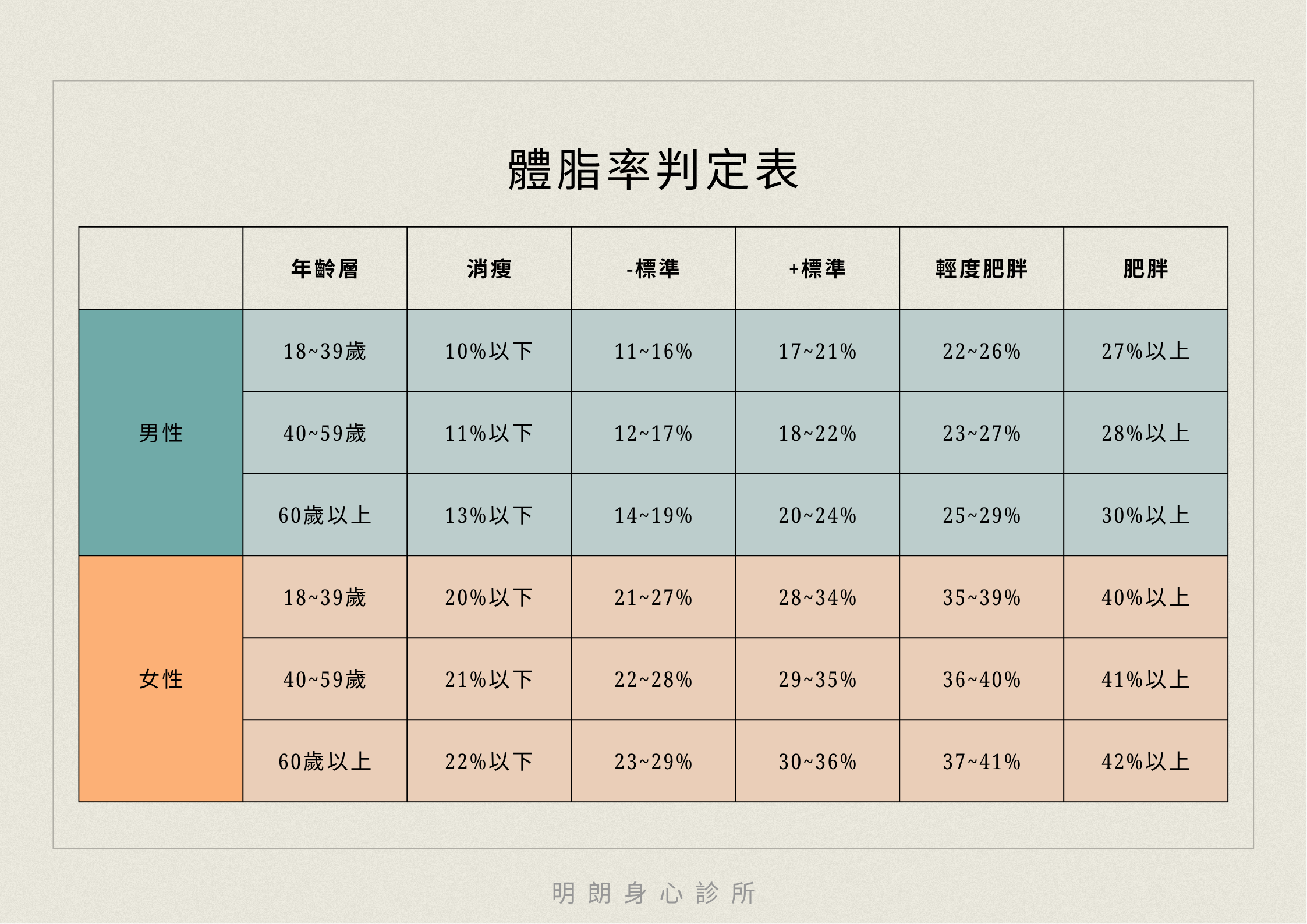 一般而言,成年男性體脂肪率超過25%,成年女性超過30%就是肥胖,而男性體脂率介於15~25%,女性體脂率介在20~30%則為正常值,確切的數據會因為年齡有所差別,年齡越大,基礎代謝率逐漸下降,體脂率通常也會越高。