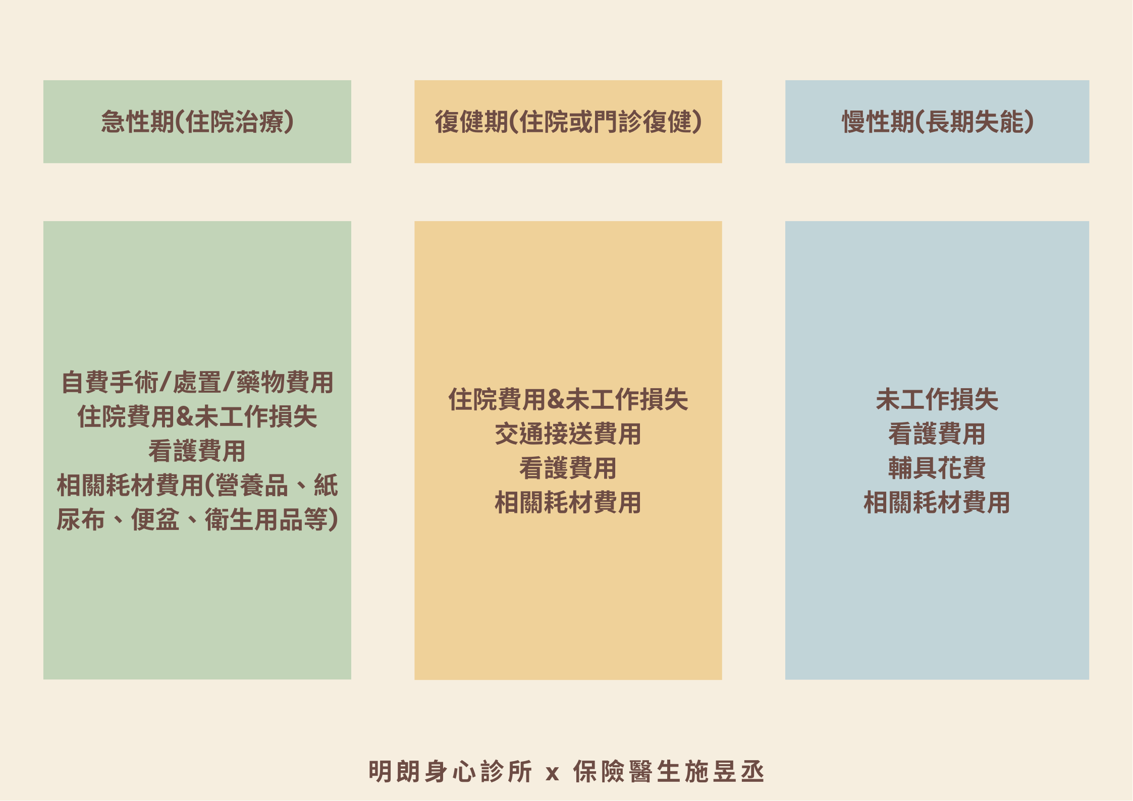 - 慢性期:症狀固定後,會因為患者的失能狀況,而影響到其工作、生活自理能力。可能會因此沒了工作,或薪水降低,或甚至生活無法自理,需他人照顧。而因應生活的轉變,也可能需要購買一次性輔具、長期照顧之耗材,造成財務上的負擔。
