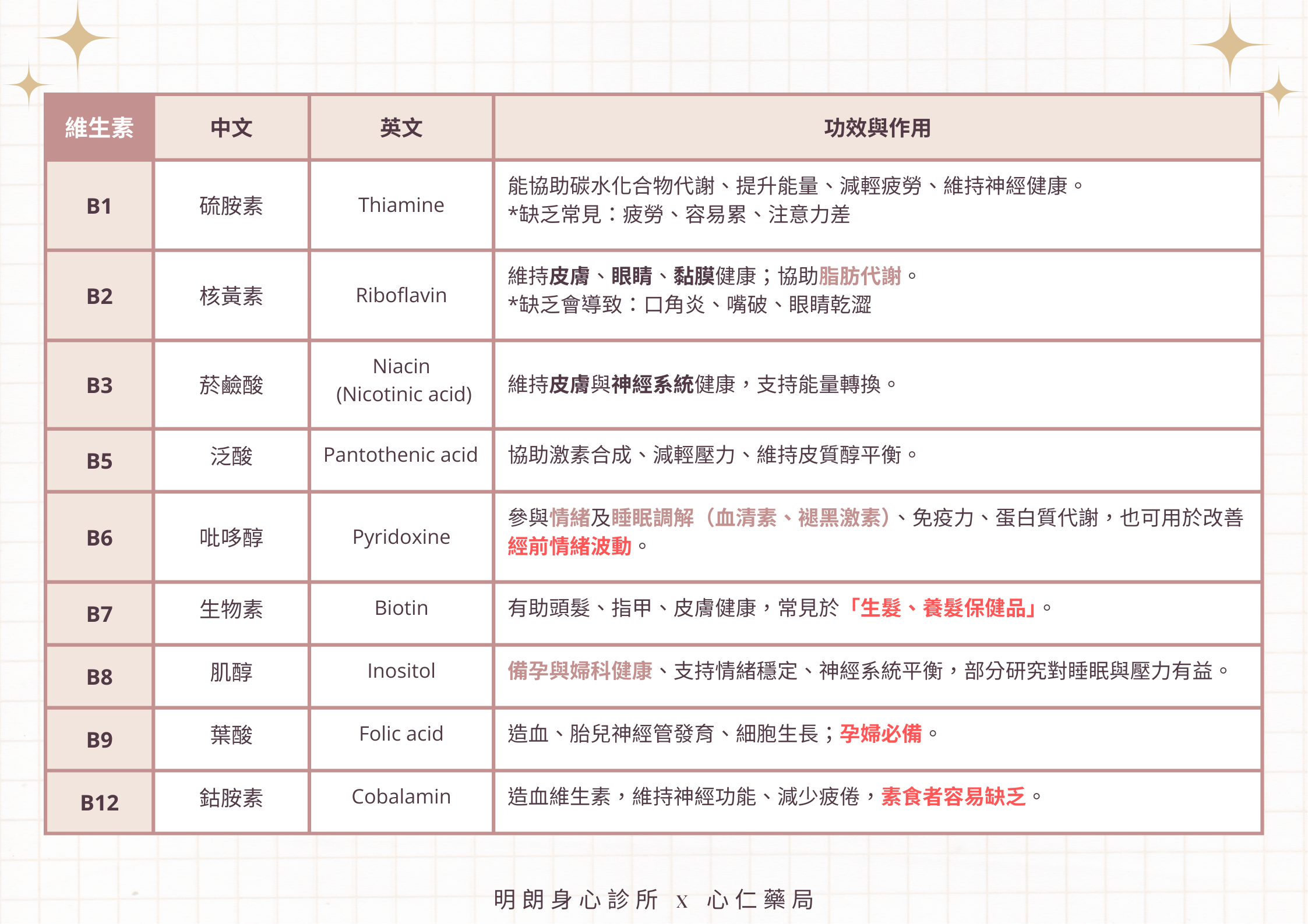 - 代謝/減重:B1、B2、生物素。