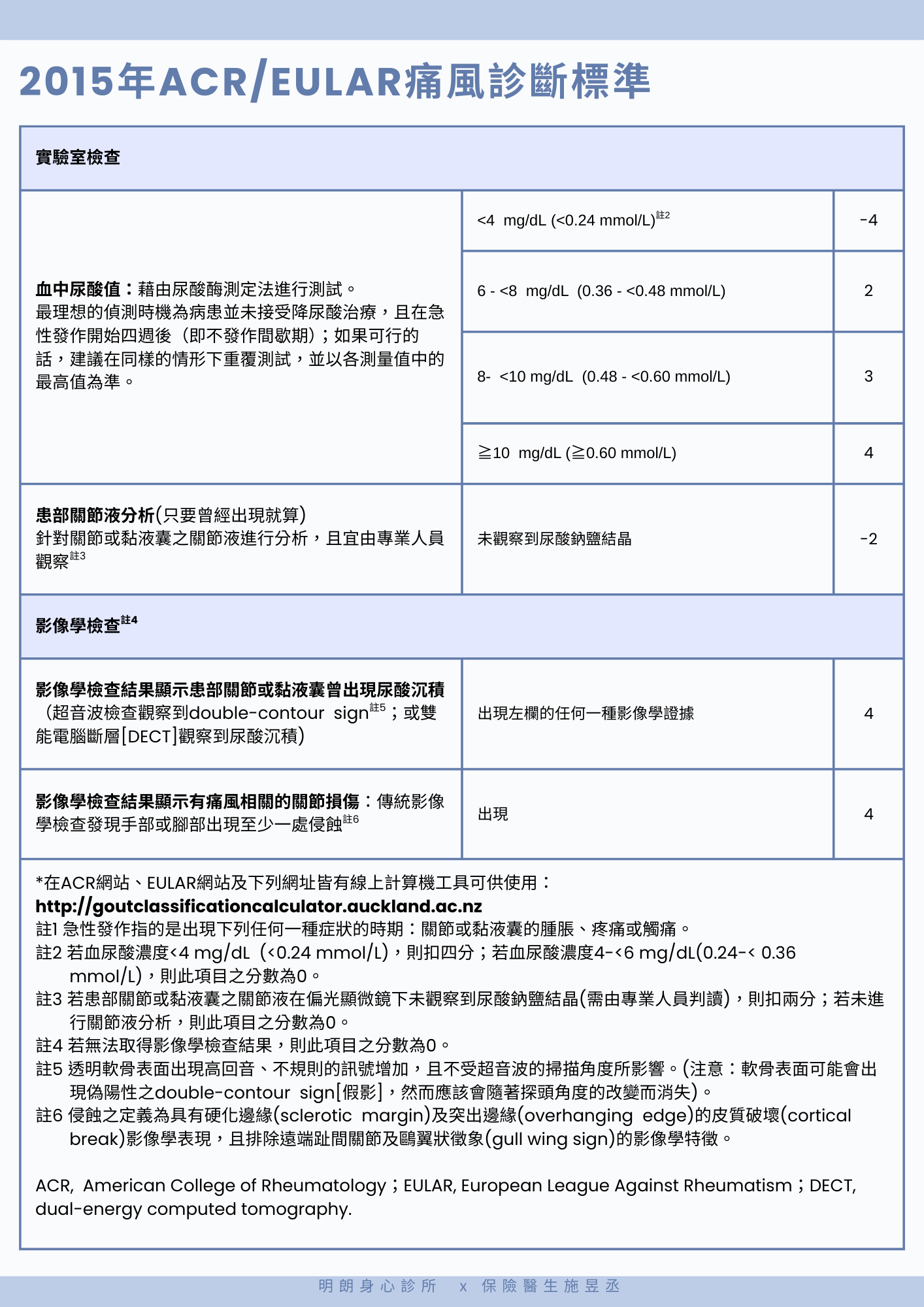 2015年,ACR及歐洲風濕病聯盟(European League Against Rheumatism, EULAR)共同推出了新版的痛風診斷標準,患者至少需發生一次關節或黏液囊的腫脹、疼痛或觸痛,若在有症狀的關節或黏液囊中出現尿酸結晶,或是出現痛風石,那就直接確診,否則須參考臨床症狀、實驗室檢查、影像學檢查等結果,進行分數計算,≧8分即診斷為痛風,如下圖所示:
