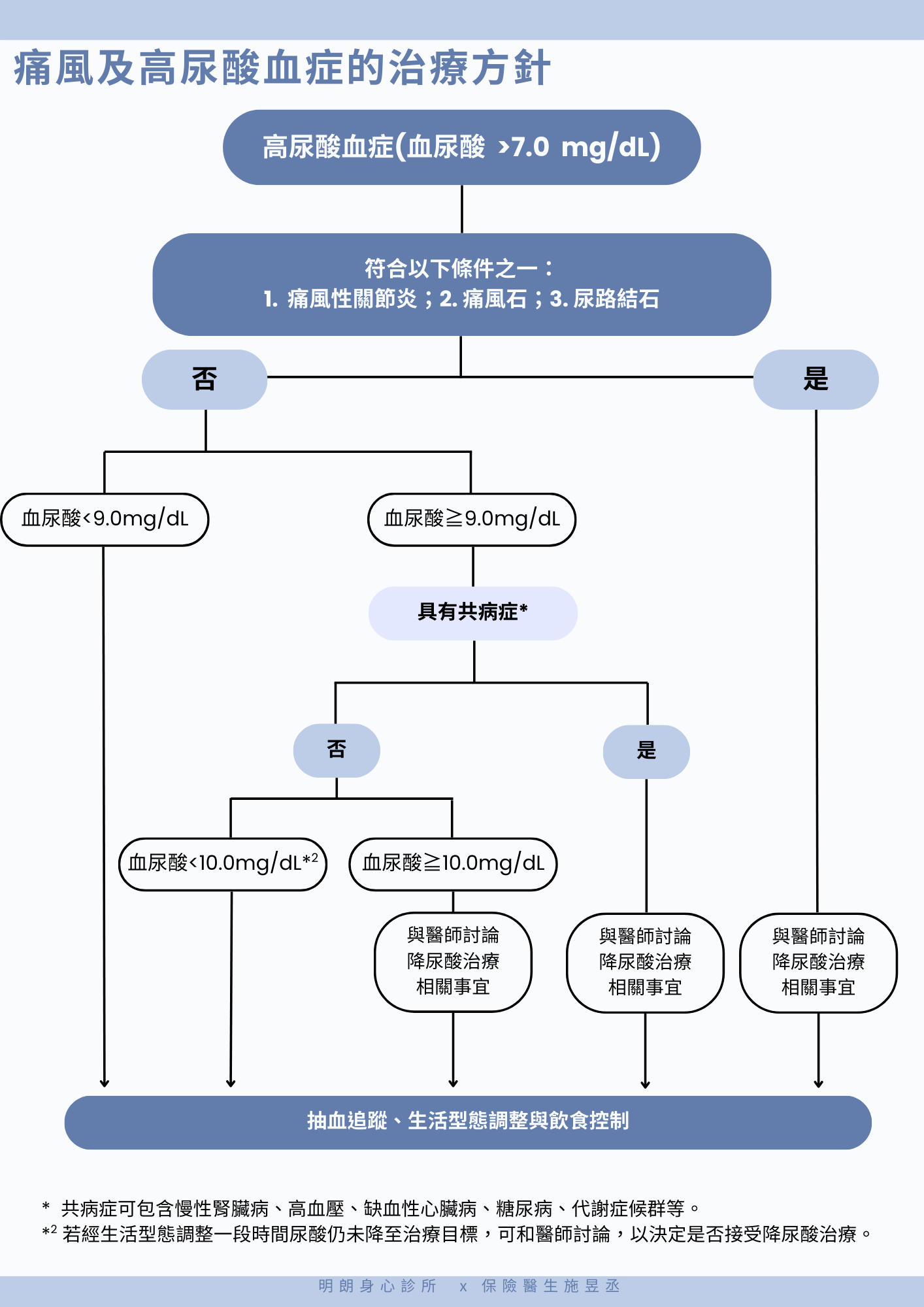 至於痛風及高尿酸血症什麼時候該開始治療呢?可參考以下流程圖