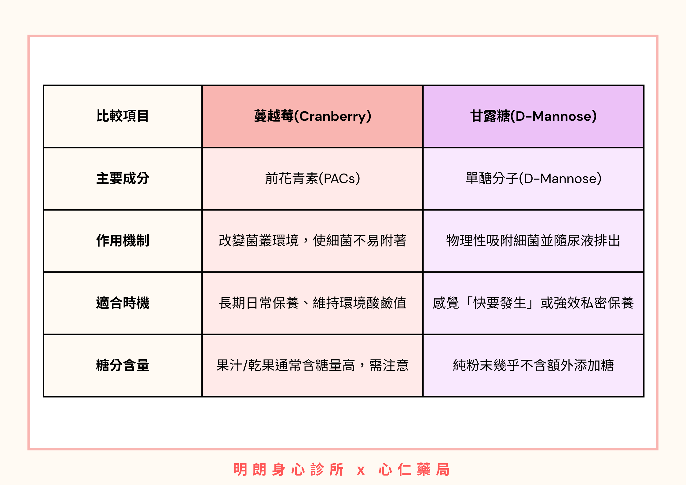 如果你只是想一般保養,蔓越莓很棒;但如果你正處於不適感強烈、或是想要盡快減緩細菌造成私密困擾,甘露糖的效率通常更高。